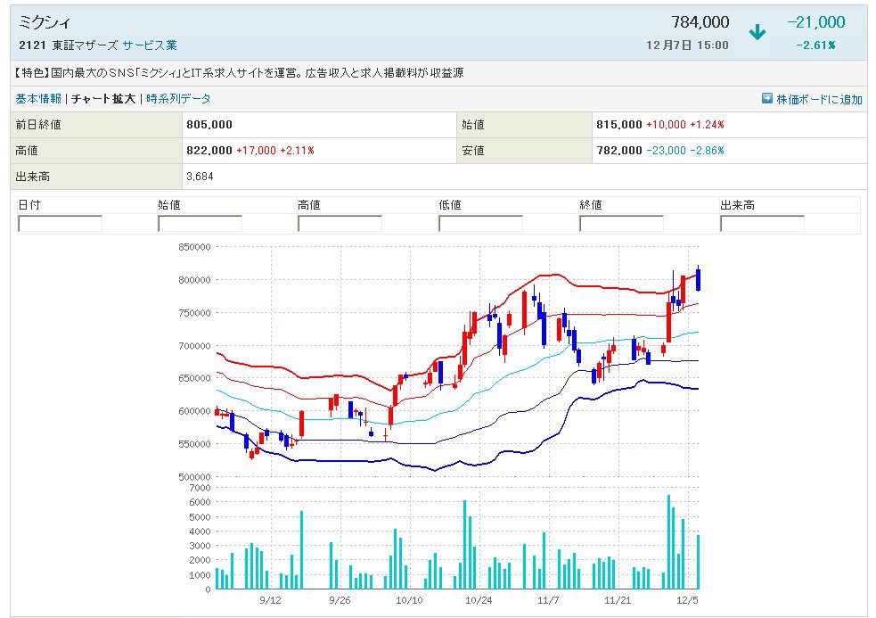 ううっ、・・ミクシィは下値を買われてまして、大きく下げないので、ここで買うと良いかもしれませんよー、火曜日か水曜日に上を目指すと思いますから、ここでもう1株買いをされたらいかがですかぁ?