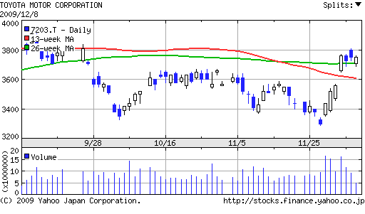 日経平均のチャートを見ていたのですが、日経平均のチャートと、トヨタ自動車(7203)のチャートは連動しているように見えますね(図参照)。輸出関連と言うことで、明日は下げるでしょうか。