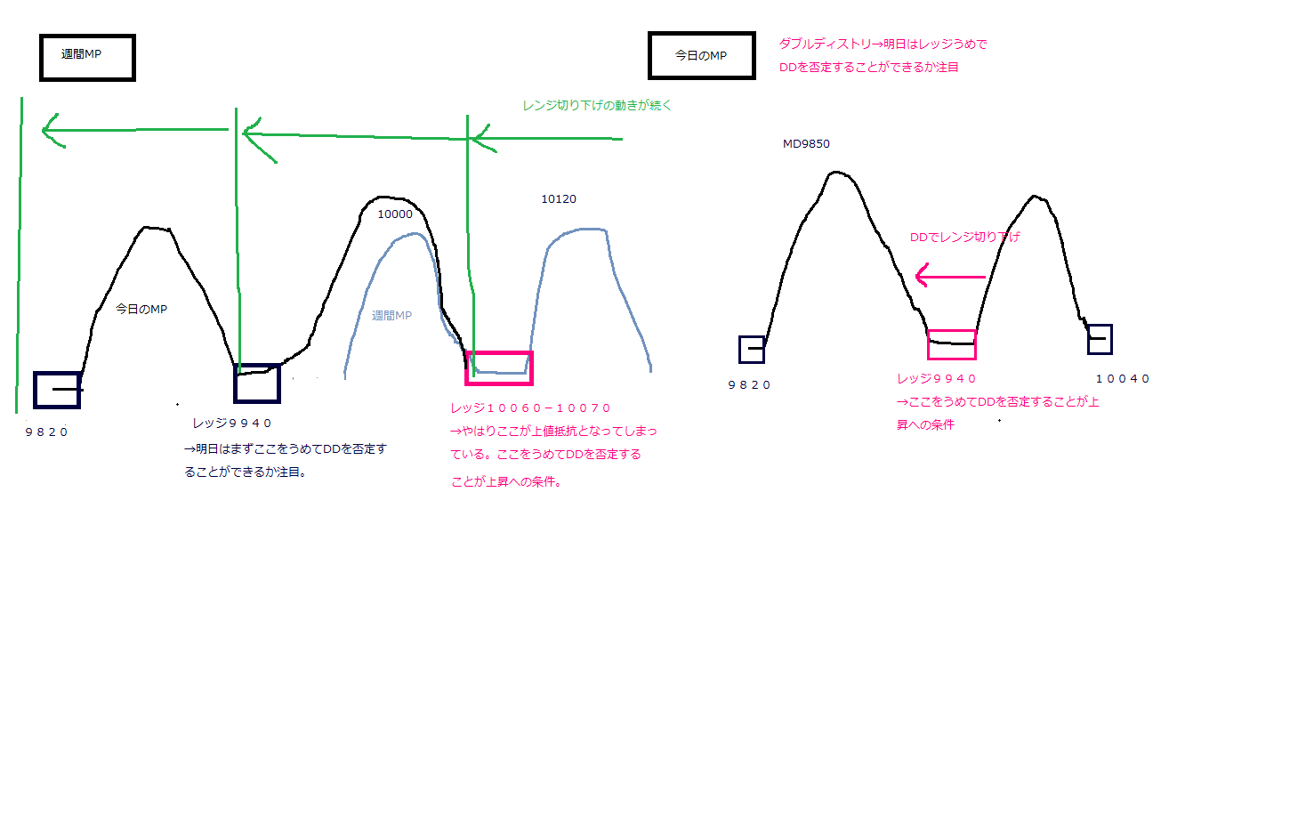 ・MPはダブルディストリでレンジ切り下げの弱気形状が続いています。