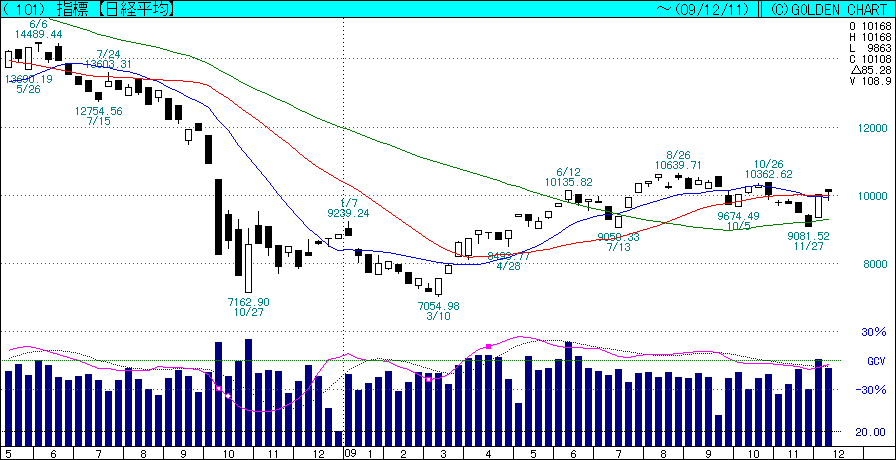 今週も日経のチャートを見てみますると、先週は一旦¥10,000を割り込みながら、金曜に大きく戻し、日足(左側・緑色チャート)で75日線、週足(中央・青色チャート)で13週、26週線を回復しており、まだ底堅い相場と申せましょう。