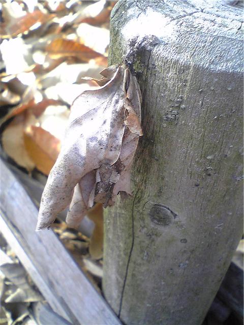 落ち葉 , みのむし,雪:落ち葉の中に隠れて、最近絶滅しそうなみのむしがいた。