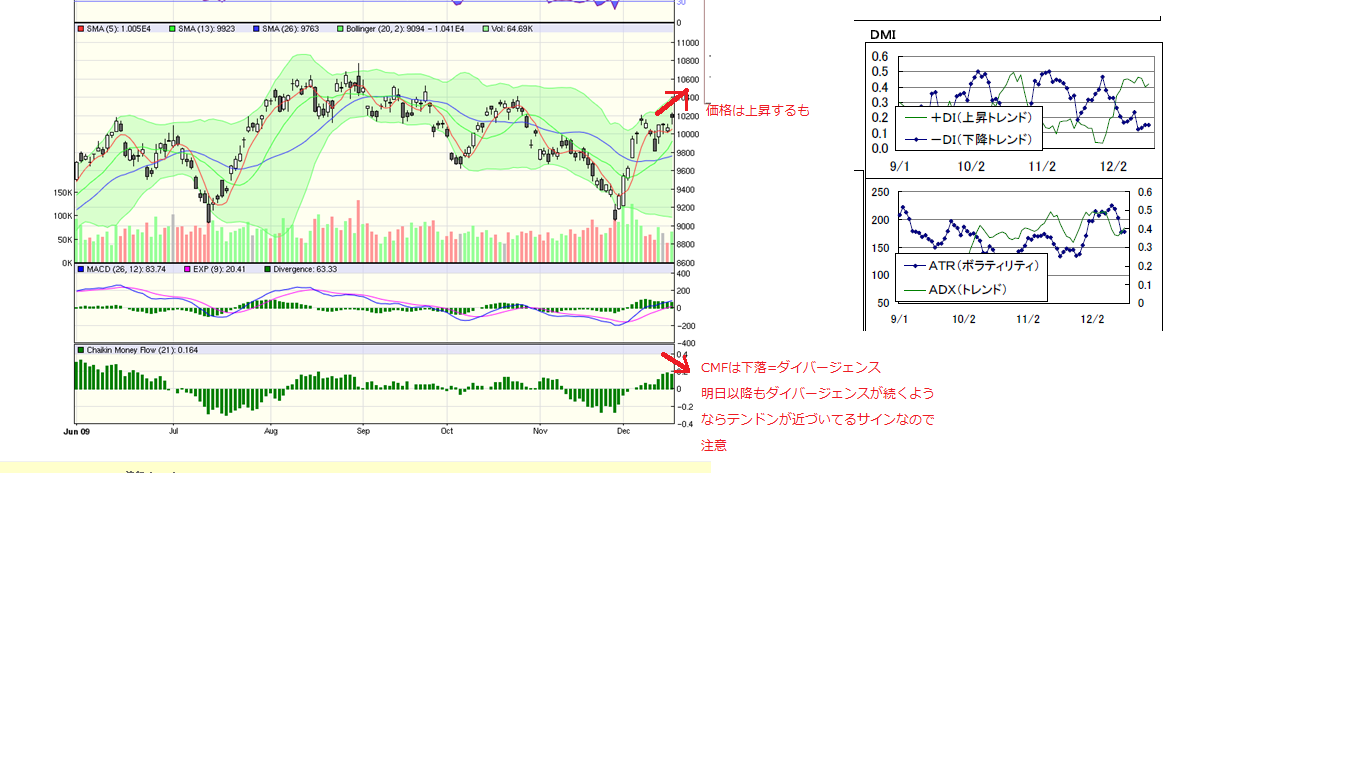 ・CMFはダイバージェンスがおきているので注意が必要です。明日以降再度CMFが上昇もしくは横ばいであれば強気継続ですが、CMFがこのまま減少していく動きになれば価格が上昇していてもダイバージェンスとなってしまいますので、弱気サインです。