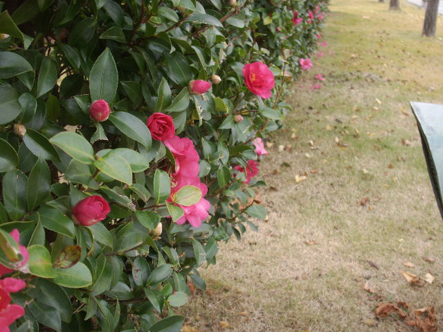 冬に至り、さざんかの垣根に花がいっぱい咲いている
