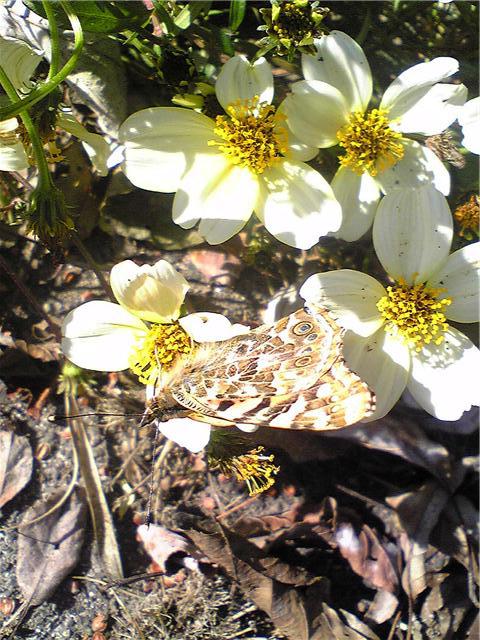 はな、ちょう、雪:雪が積もりましたが、今はいい天気です。昨日は寒い中、蝶も舞い、日向ぼっこ。ウインターコスモスにヒメアカタテハが給蜜に来ていました。農業センターにて。