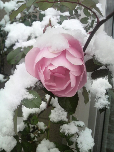 我が家ではまだバラが咲いており、雪との取り合わせは珍しいと思い、写真を撮りました。