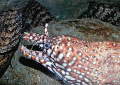 いずれも日本近海に生息しており、同施設で干支展のために捕獲したものだという。三つの水槽で種類別に飼育されているが、体長八〇センチのトラウツボが口を開けるとトラと同じように迫力満点。水槽をのぞき込んだ幼児がびっくりして母親に抱きつく光景もみられた。