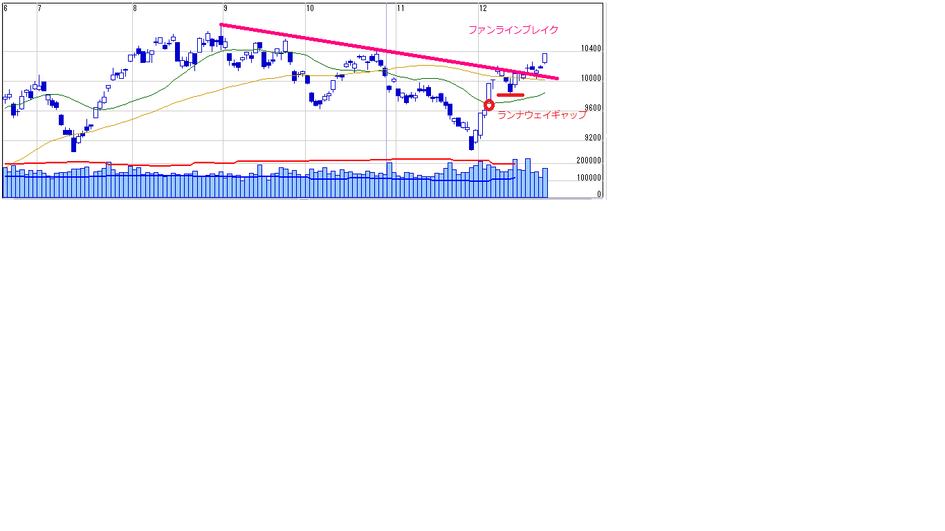 でもね、3日のランナウェイギャップで上昇トレンドは決まったようなものなんだけどね^^;(10日の下げでもこの窓をうめなかったのでこの窓を埋めるまでは上昇トレンド確定)(このあたりの詳しいことは過去日記の「4つの窓」についてを参照してください)