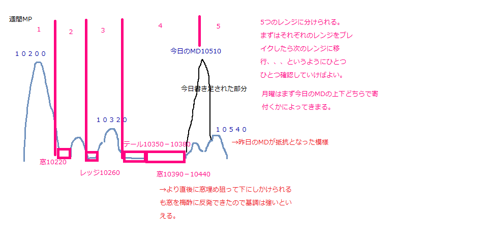 ・10510で相当な壁を積み上げたので、月曜は10510の上下どちらでよりつくかで需給が決まりそうです。