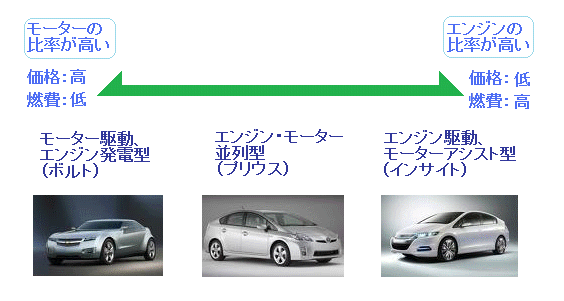 一口にハイブリッドカーと言っても、仕組みは色々。(図参照)