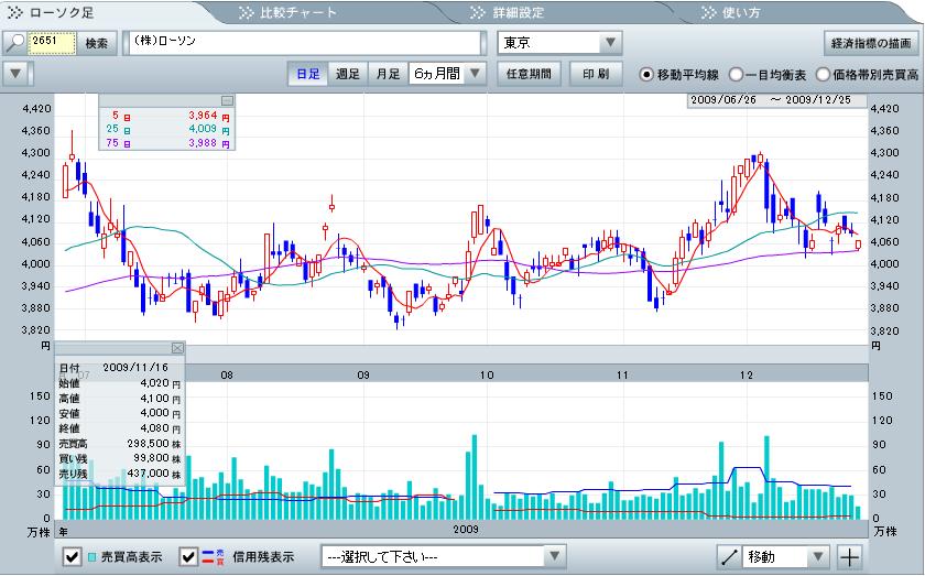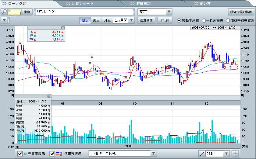 日足チャートでは12月の初旬に下降トレンドへ切り替わり、25日移動平均線を下へ突き抜け、下値支持線をどんどん下へ下へと突き抜けているのかな。