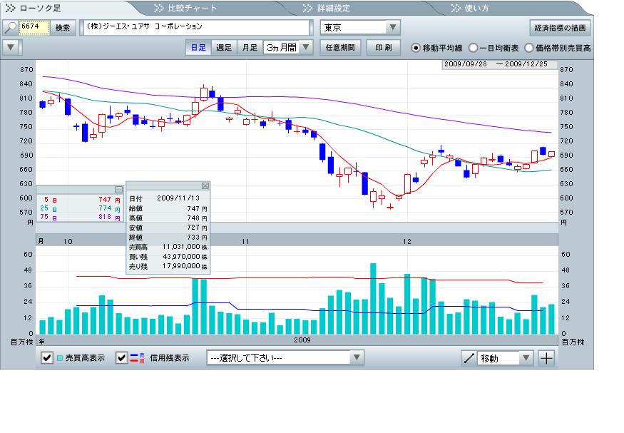 2009/12/26GSユアサ が反発。株価指数など市場全体が利益確定の売りに押される中、本日高値の703円で取引を終了。国内格付け会社のJRIが、同社の格付けをを「BBB-」から「BBB」に格上げした事が素直に好感されたようだ。」