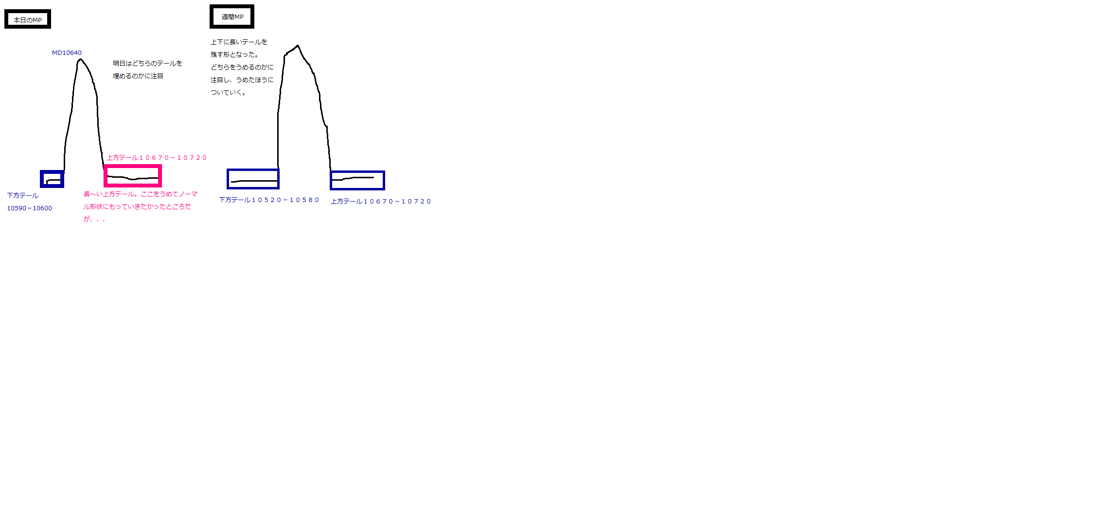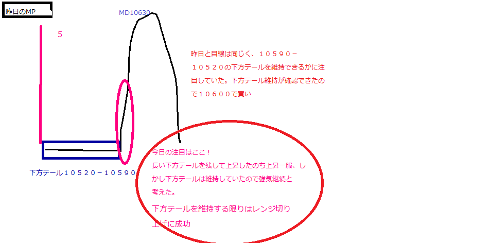 ③10660をこえないと上方テールを残す形となり、形状的には弱い。10660-10600のどちらかを抜けるまではこのレンジ内でのもみ合いと予想