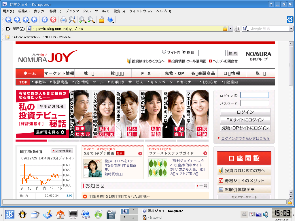 写真は、knoppixのブラウザで野村ジョイのログイン画面を開いたようすです