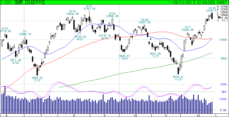 ただ、週足(中央・青色チャート)を見ると、年末ラリーのおかげで最も恐れた週足デッドクロスを免れた形になっており、仮に調整となった場合も日足、週足ともに抵抗線がある¥10,000付近までで下げ止まる可能性が高いのではないかと見ておりまする。