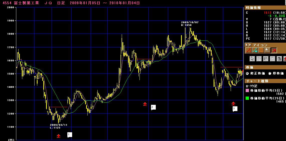 写真の1,2,3の印の部分を良く見ましょう。急落の後は、実は、中期ねらいなら、赤い線の間は、どこでも「買い」なのですよー