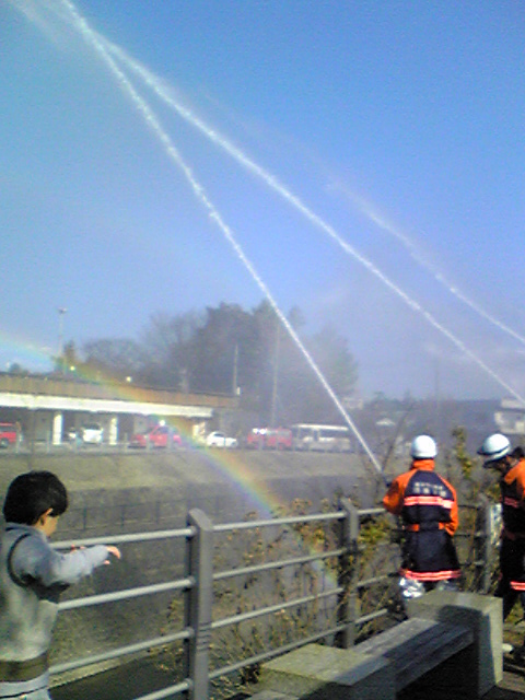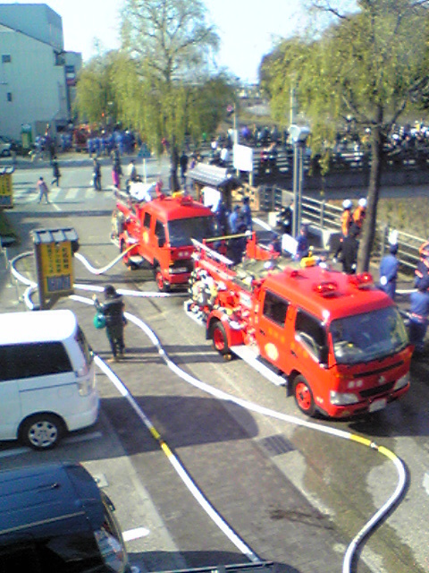パレードが終わると今度はすべてのポンプ車による川への放水が始まります。建物から出てすぐ近くに地元の消防団がいたので後輩と話をしながら一斉放水を眺めました。