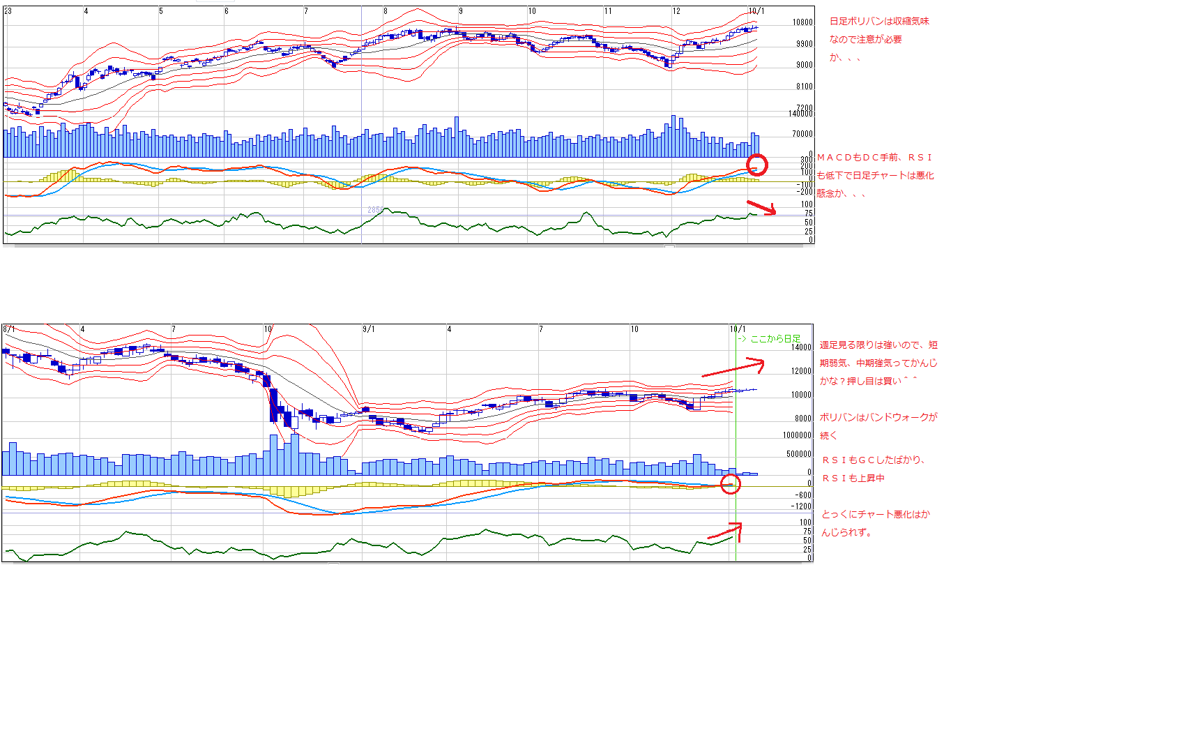 チャートを見る限り、日足⇒弱気、週足⇒強気継続、月足⇒新たな上昇相場の始まり、、、といった感じで、短期弱気、中長期強気です。中長期上昇相場の始まりかもしれないので、あくまで押し目買い狙いで行きたいと思います。