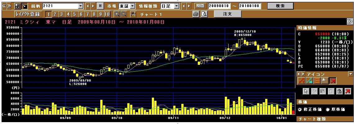 あ、売り買い上手の○○さま、いらっしゃいませ!!ミクシイの買い650000で4株は昨日の分だけ出来てますよー