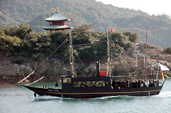 坂本龍馬率いる海援隊が乗った蒸気船をモデルにした「平成いろは丸」が9日、広島県福山市・鞆(とも)の浦と沖合約600メートルの仙酔島を結ぶ市営渡船航路に就航した=写真。