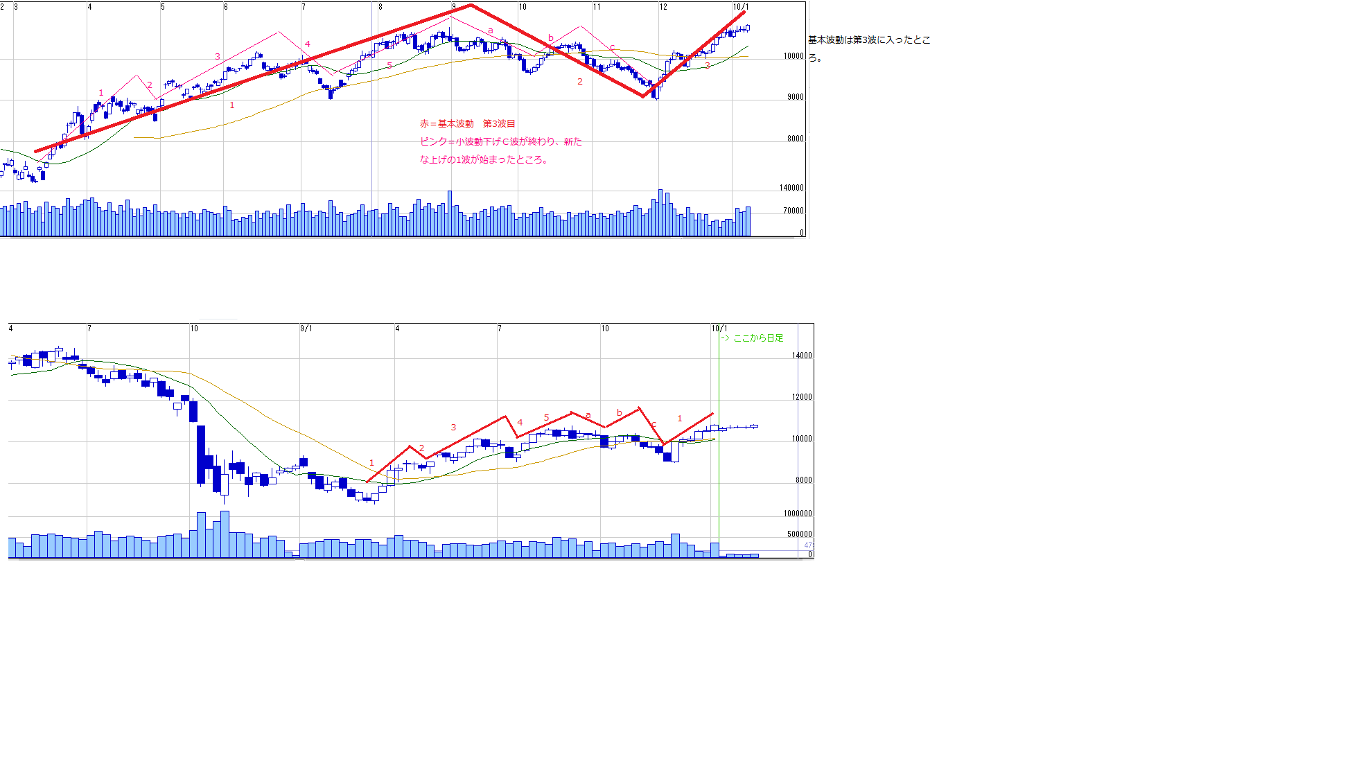 ☆以上を総合すると、11000台に重要なポイントあり。それらをクリアしつつ、200週線13500の近辺、そして最終的にはエリオット3波の目標15000を目指しているものと考える。