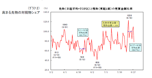 ・5月上旬の相場はまさにエネルギーの膨張と株価の上昇が連動した「順な相場」であった。点綴的なブル(強気)相場である。5/1~5/20の東証一部売買代金と株価指数先物の売買金額の比率(先物・現物比率=先物金額÷現物金額×100)は平均で63.7%であった。(画像1)ところが、8/17~26の「先物現物比率」は平均で99.7%に達している。現物の売買が低迷してるにもかかわらず先物の売買金額が拡大しているため「先物・現物比率」が急上昇している。本来的には現物が実体であり、先物オプション等のデリバティブは影のはずである。ところが世界のあらゆる種類のデリバティブでポートフォリオを構築するマネージドフューチャーズ(CTAの一種。以下MF)が台頭して以来、影と実体の関係が歪になる現象が起こっている。