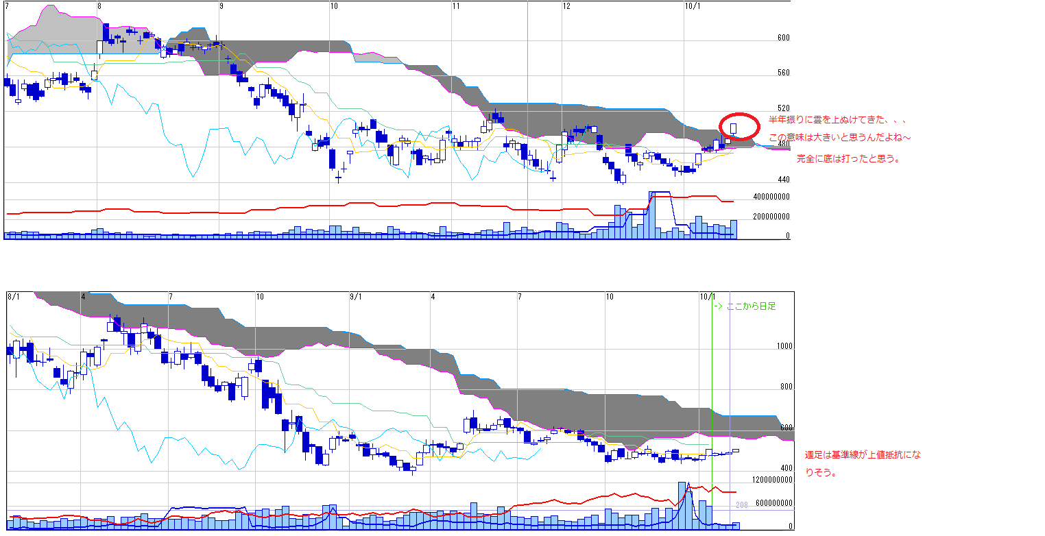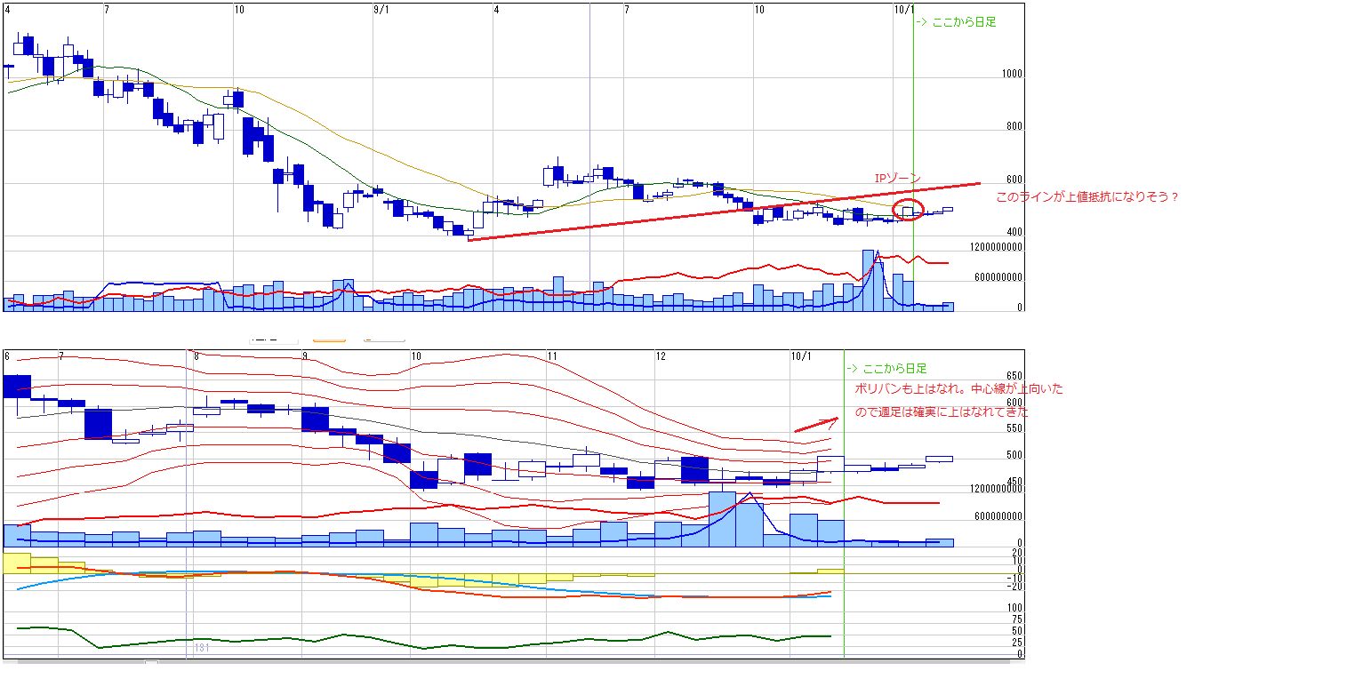 ・週足は中心線が上向いたのでボリバンは完全に上はなれた
