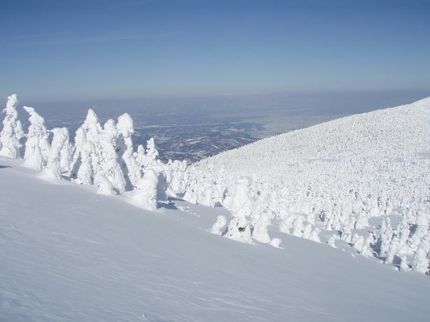 遠くに飯豊山、蔵王、近くに西大嶺、中大嶺が見え、眼下には米沢の街が広がる。