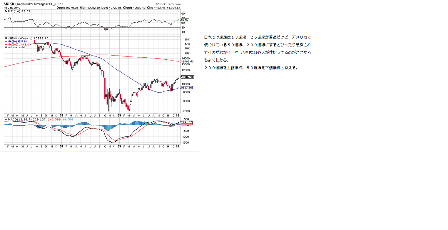 ・日本ではあまり使われることのない、週足50週線と200週線の様子です。しっかり意識されていることから、相場は外人がしきっていることがここからもわかります。