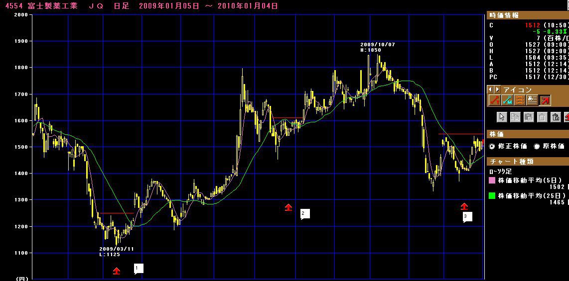 写真1の1,2,3の印の部分を良く見ましょう。急落の後は、実は、中期ねらいなら、赤い線の間は、どこでも「買い」なのですよー