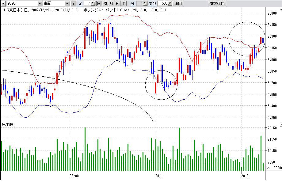 中心線(日足ならたいてい25日線、週足なら13週線)の向きが大事で、中心線が横ばいから上むいてきたらボリバンも上に押し上げられる可能性が高く、下向いてきたらおしさげられる可能性が高い、、、
