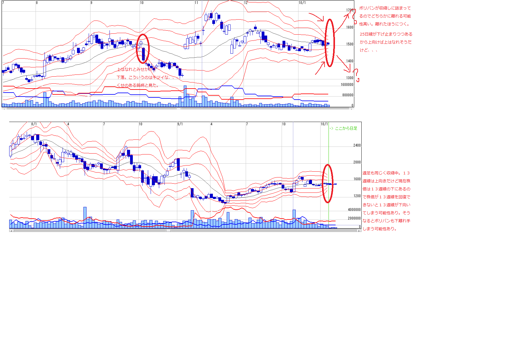 ・個人的には①25日線の上向き②13週線を回復できればボリバンは上はなれる可能性が高いと思っています。