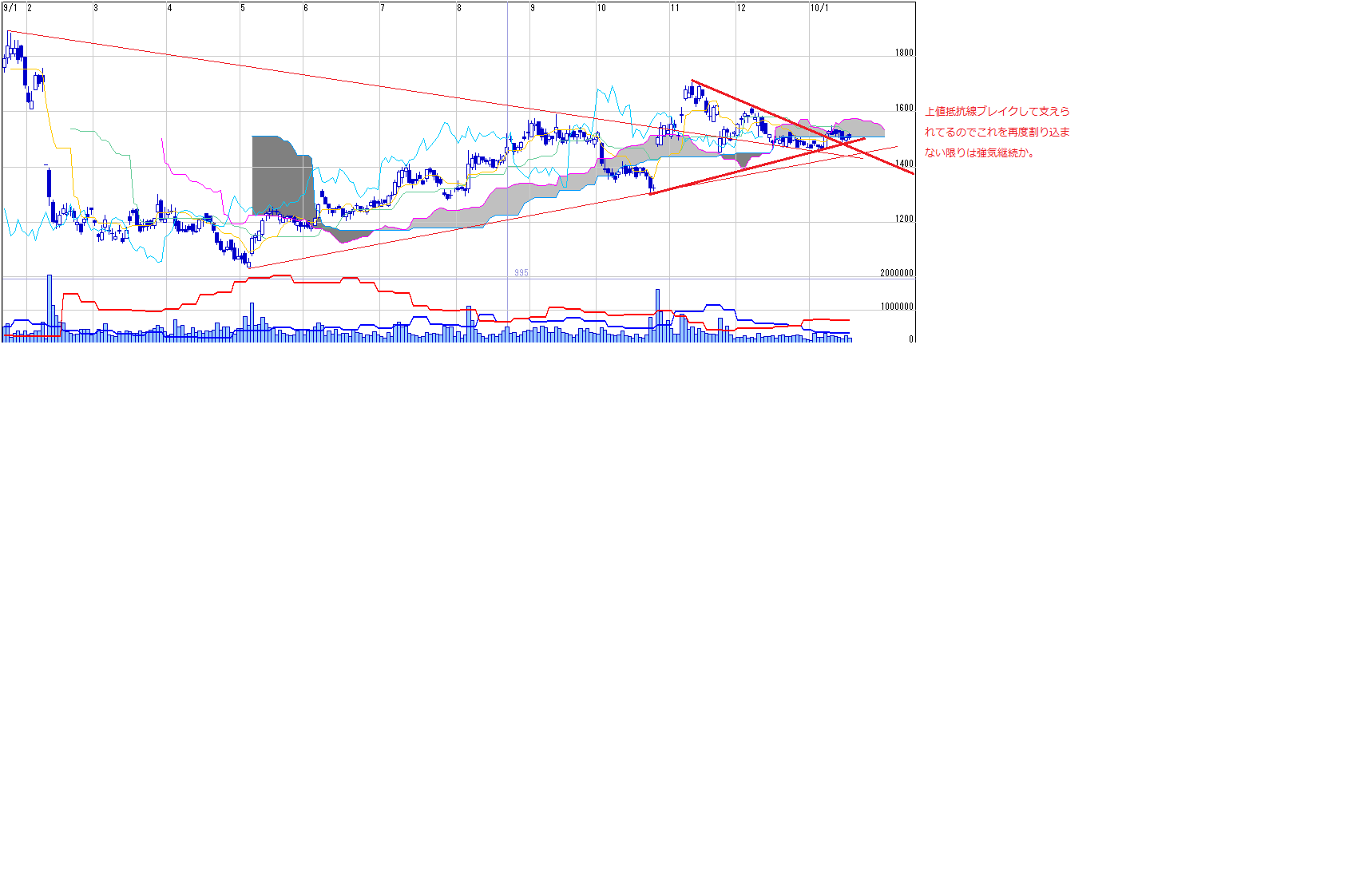 ・移動平均線の形が悪いのと一目の雲の下にもぐりこんでしまっているのが気になります。