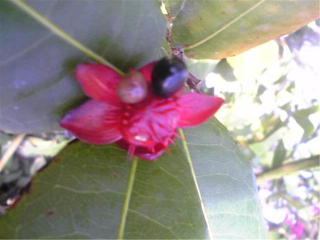 赤い萼と花床の上に着いた黒い果実がそう見えるそうです。