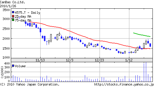 現在自分はキャンバス(4575)の値動きに注目しています。約1週間で1.5倍になった後、2000円を目前にして失速し2日続けて急落しました。図の赤線は25日、緑線は75日移動平均線(上場日が最近なので途中からの表示です)です。これをみるとずっと25日平均線の下を推移した後、急騰して一気に25日線を抜き、失速して現在は25日平均線(約1500円)付近まで下がっています。このまま25日平均線下回ってしまうのか、ここで反発するのか。また、その上の2000円越えや75日平均線越えができるのかがこれからの焦点になりそうです。