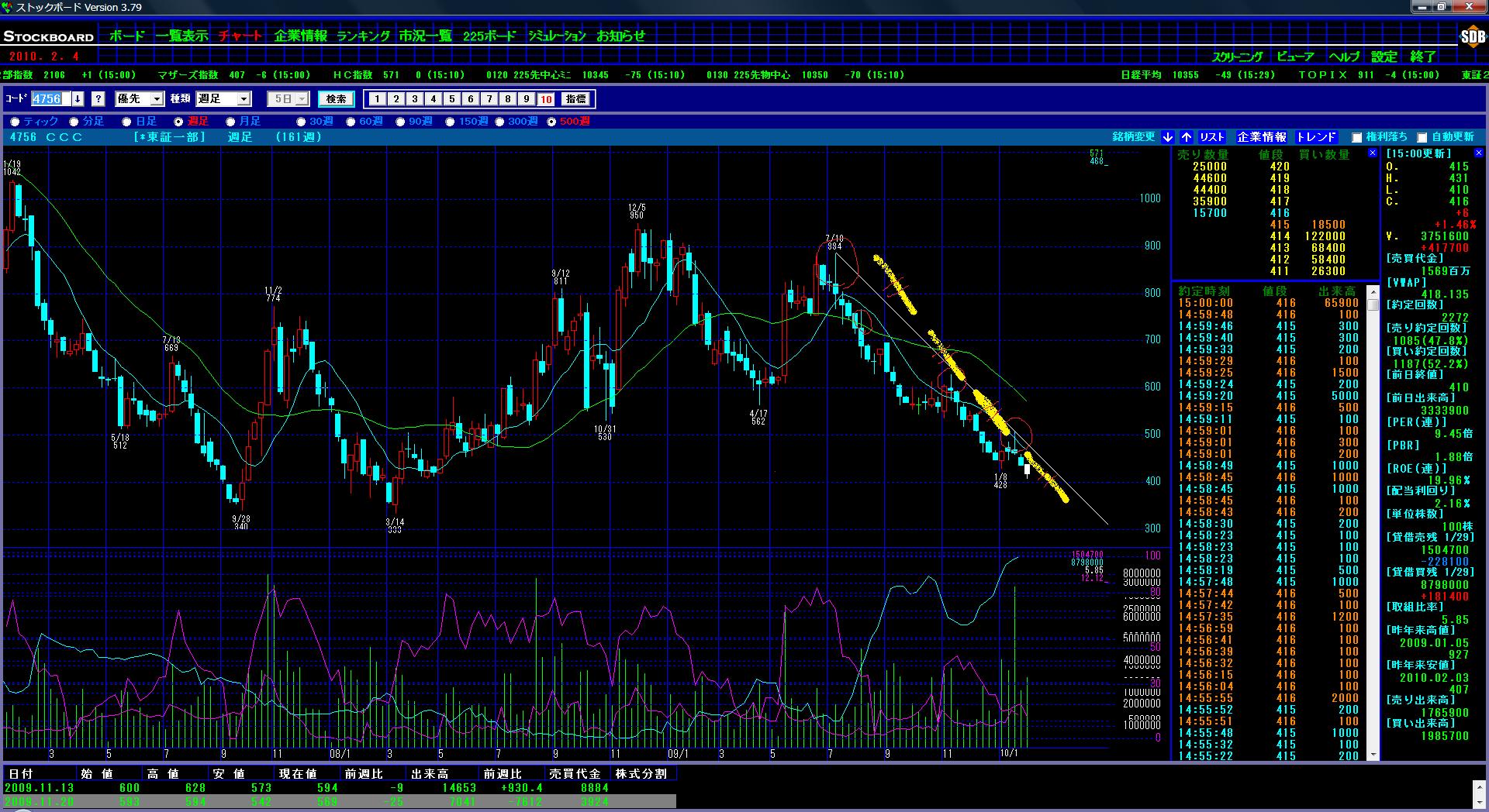 同程度の値幅が普通だと思われますので今回仕込まれた空売りの利益確定は350円あたりを予測します。