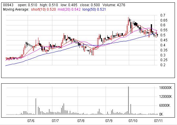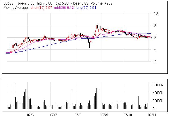 上記チャートは2006年初頭に買い込んだ一部の中国株(香港)銘柄で順調に最近までは上昇してきていたが、最近になり世界的サブプライム問題等、また中国当局が、本土の個人投資家が香港株を直接買い入れることを容認する試験プログラム等を遅らせるとかの懸念も生じ上昇曲線は膠着状態になりつつある。長期投資として来年夏の北京五輪まではと思っているが、果たしてどうなるか?長期投資の賭けでの失敗は立ち直り出来ない程の時間を浪費する。