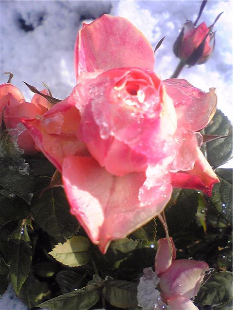 はな ばら 雪:雪の中にバラが咲いています。最近のバラは耐寒性が抜群です。この後も何ともないように咲いています。
