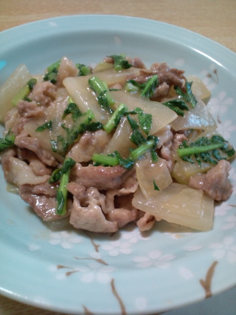 今回は豚肉と大根と大根の葉っぱを適当に切って適当に炒めただけです。
