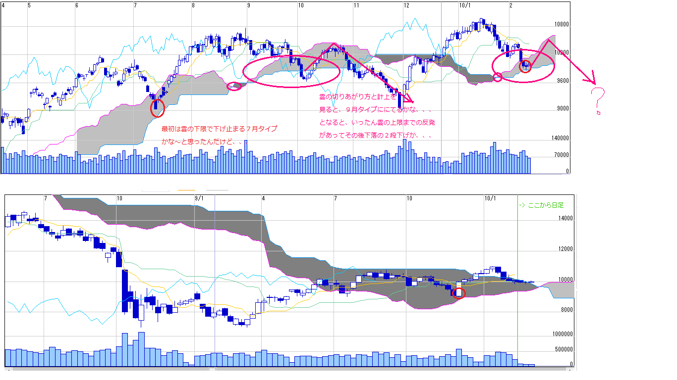 一旦雲の上までの反発はありそうですが、その後どうなるかですね、、、^^;9月タイプだと、雲上限で跳ね返されて再度下落、、、となりますが、、、