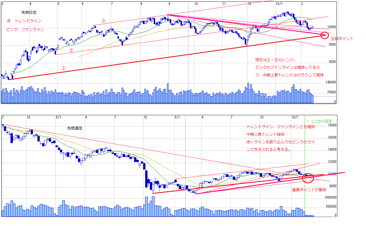 ・太いラインが重要と考えているラインです。重要ラインは維持しているので、弱気というより、押し目の範囲かと思いますが、太いラインを割れてきたら弱気転換だとおもうので、逃げます(笑)