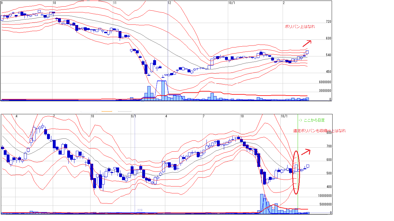 ④週足ボリバンの収縮がすすみ、収縮からどちらかに離れそうな状態であること、そして、上離れの兆しがあること。(下離れてしまったものは却下)