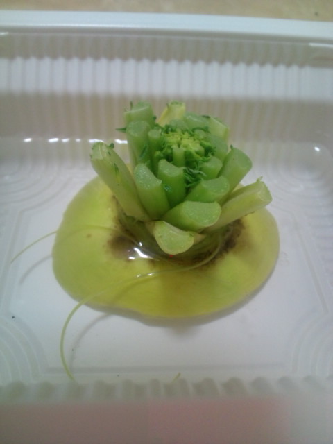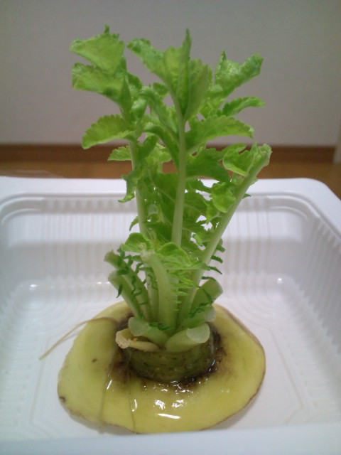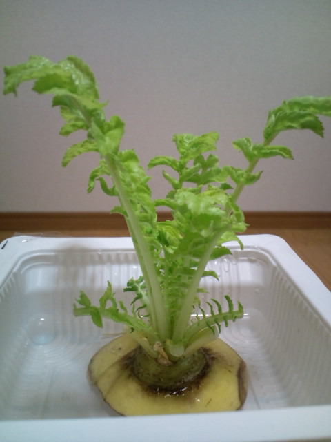 これも先日日記に載せた「男の料理」の野菜炒めで使った大根と葉っぱの根元を少し残して水につけておきました(写真左)。