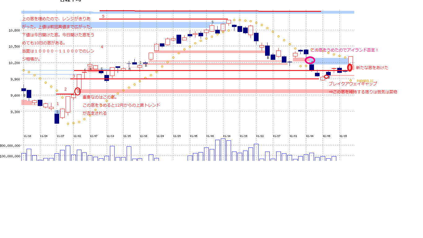 下値は本日開けた窓、これをうめても(ランナウェイギャップなので意味はない窓)10日に開けた窓がある。10日の窓を埋めた時点で弱気転換すればいい。