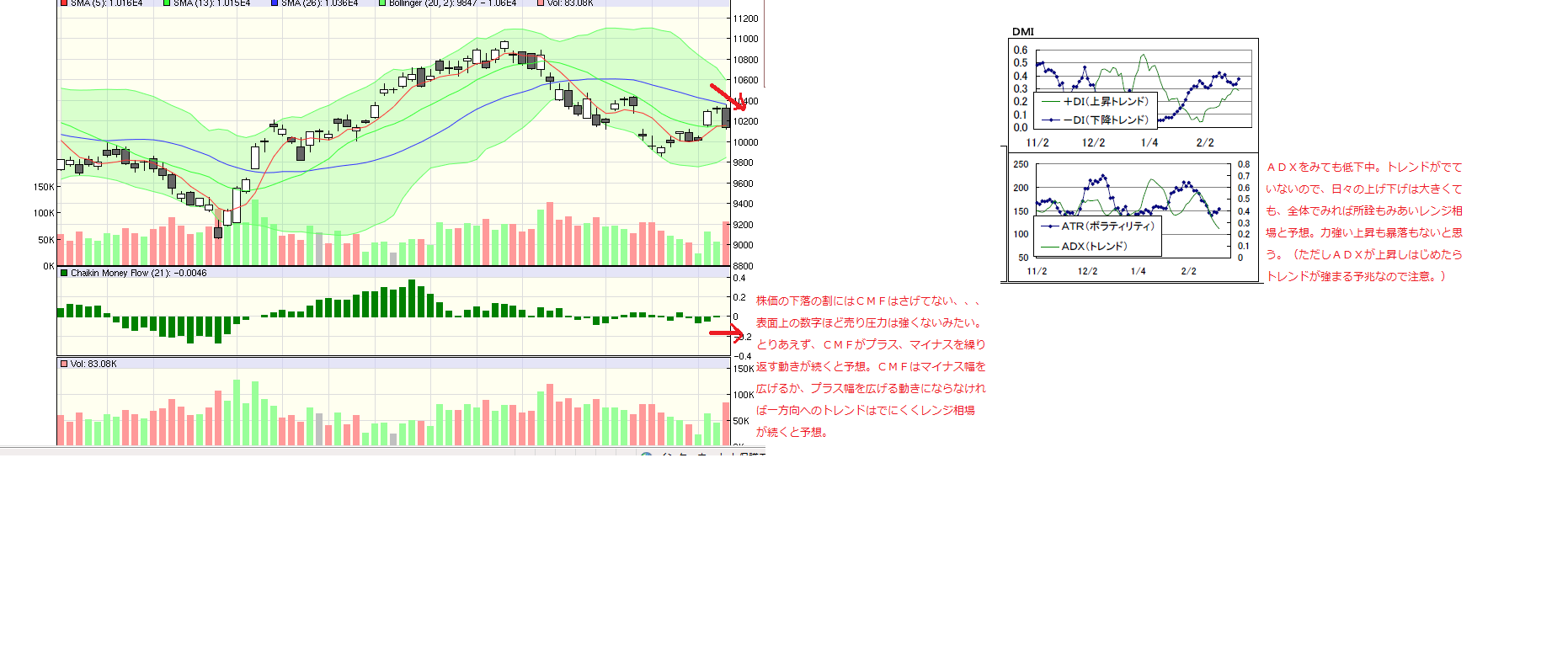 CMFもDMIも、どちらかに一方向のトレンドが出るというよりは、日々の上げ下げはあってもレンジ相場が続くような感じだけど、、、