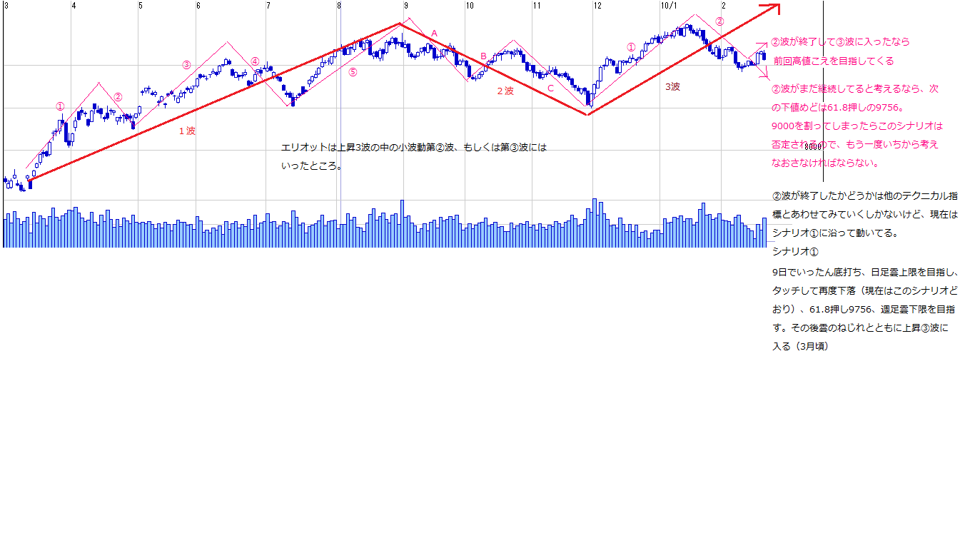・61.8押しで止まらずに9000割れてくると上記のシナリオは全て否定されるので、また1から考え直さなくてはならない。(めんどくさいからやめてね^^;)