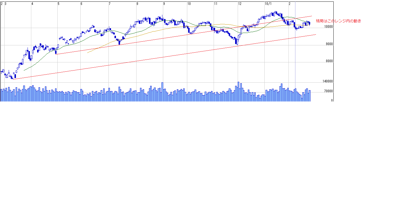 ・トレンドラインで見ると、レンジ内の動きにすぎない。