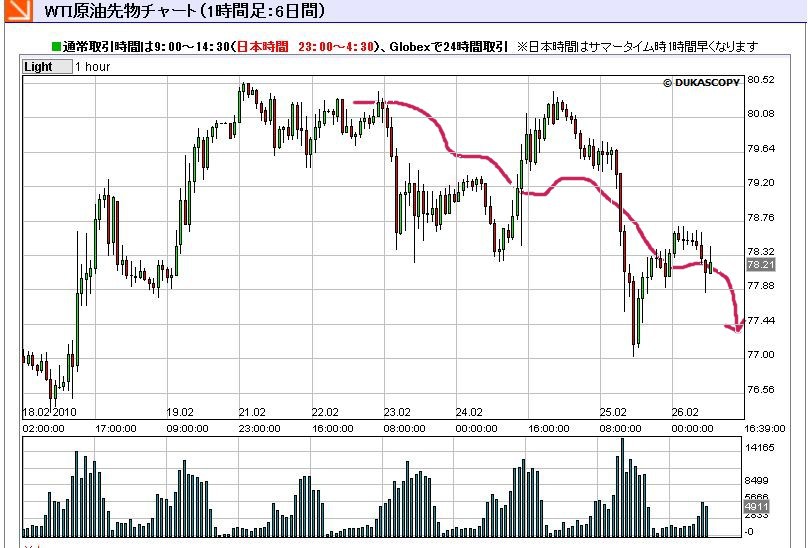 図の赤矢印線は、予感の時刻からの原油相場の推移。