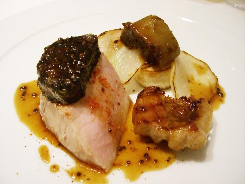 たしか血を固めたソース添えです。あっさり調味のお肉にコクのあるソースで、かなり深い味わいでした。