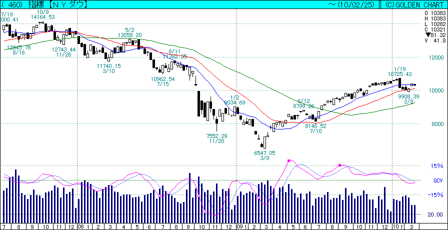 たらればの話をしても仕方ないので、もう少し具体的に申すと、添付紐育ダウの週足を見て頂きたく。まず2007年12月に赤(26週線)と青(13週線)がデッドクロスしておりまする。その後2008年1月、3月でそれぞれ13週線、26週線が緑色(52週線)と長期デッドクロスしており、こうなるともう「売り」。少なくとも再投資などせず「利確」すべき時なのでござりまする。