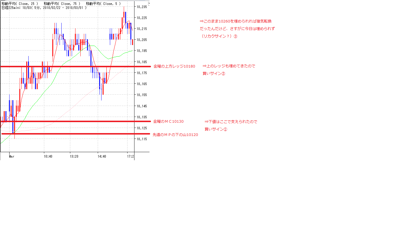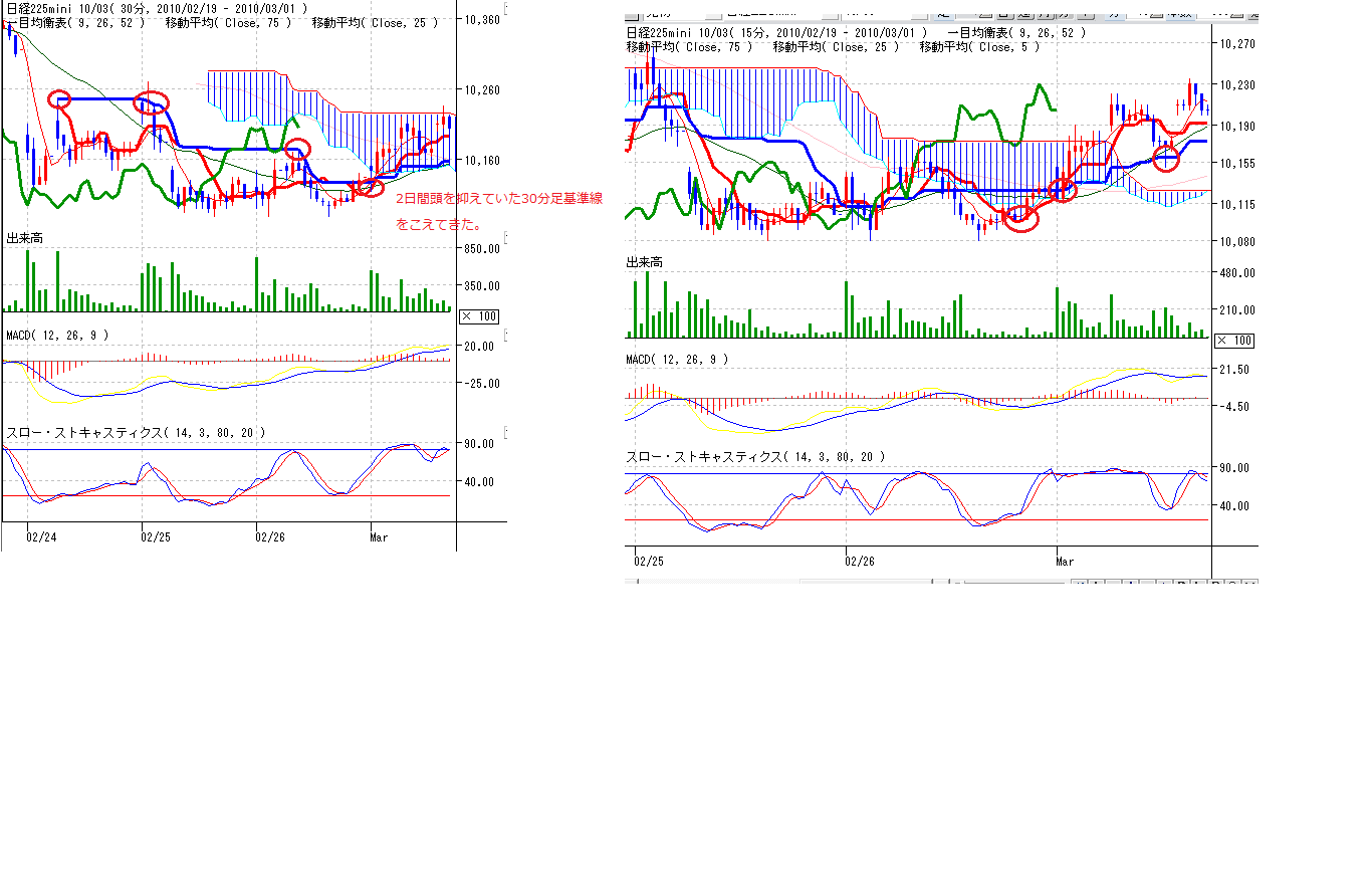 ここ2日間上値抵抗(というか売り仕掛けのポイント)となっていた30分基準線を上抜いてきた。